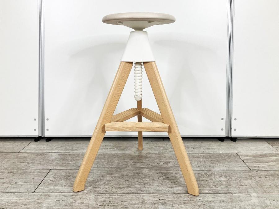 形は古典的な作業用スツールですが、機構部に使われた色鮮やかな樹脂と、木の質感との対比が斬新な印象を与えてくれます。