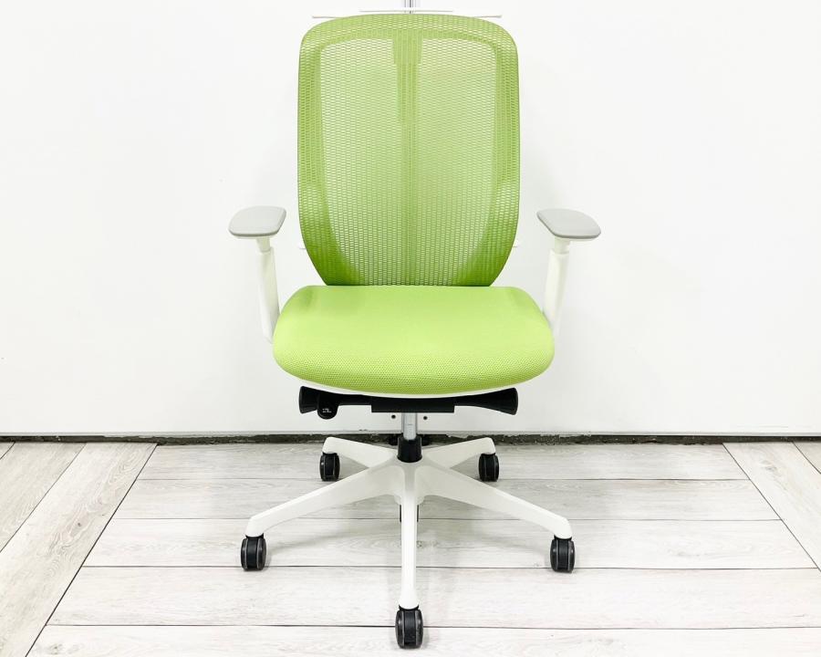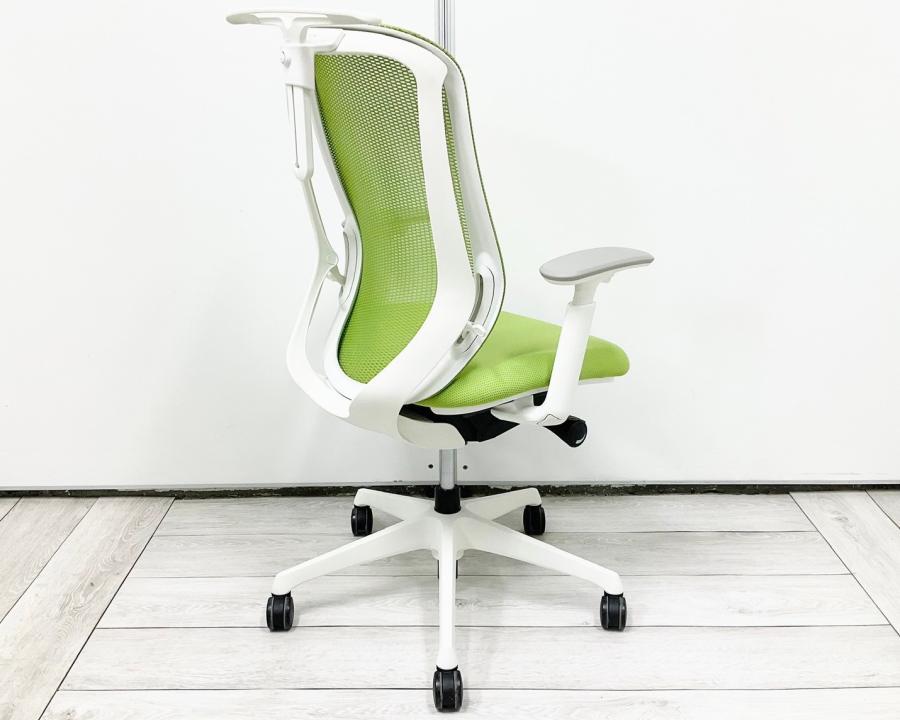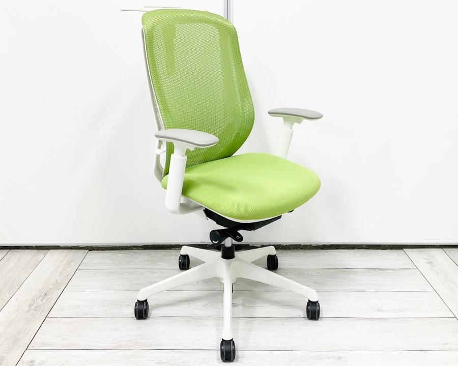 三次元曲面が身体にフィット!前傾チルト機能付き大人気メッシュチェア!清潔感と爽快感のある明るいグリーン×ホワイトフレーム仕様! ■オカムラ/シルフィーチェア(Sylphy)/ライムグリーン 肘付き ハイバック 背面メッシュ 可動肘