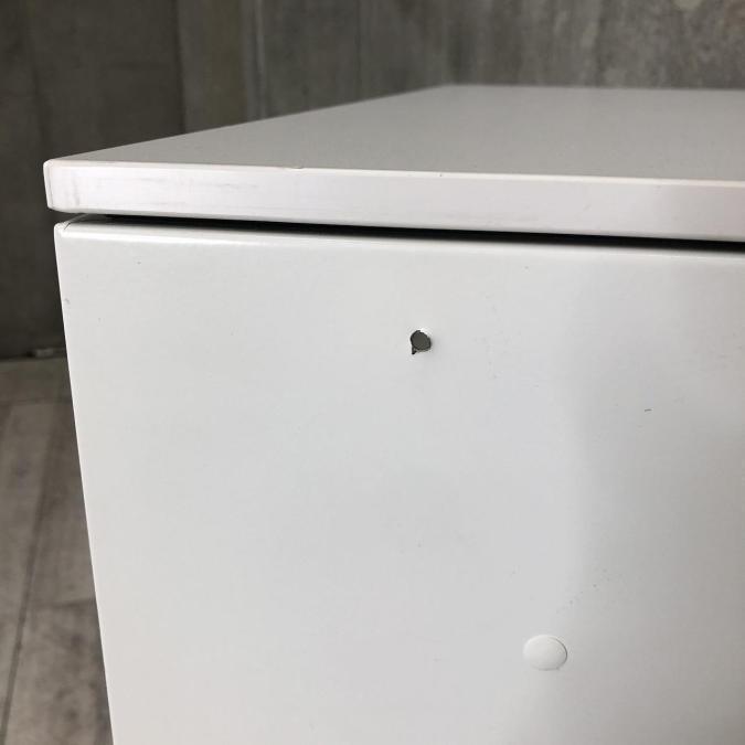 - 目立つ箇所複数あり深い傷・凹みが商品全体にある。(例、天板、正面、背部、サイド部分にある。)
