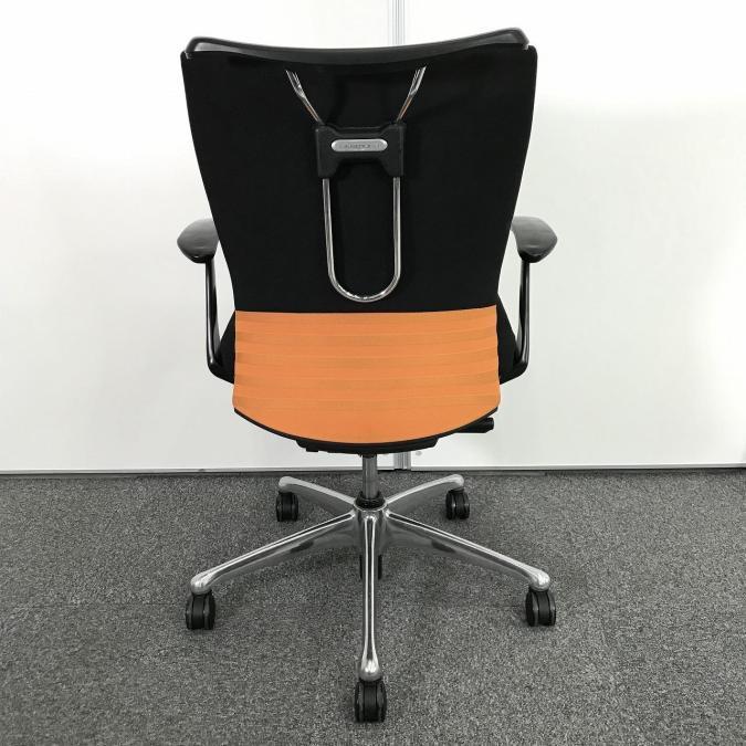 【人間工学に基づいた快適な座り心地!背あてのしなやかな曲線が背中にフィット!】■オカムラ製 フィーゴチェア (feego) 肘付きミドルバック シームレスタイプ ■固定肘 ■ブラック×オレンジ ※コートハンガー外し跡のある商品となります。【入替セールにつき30%OFF!】