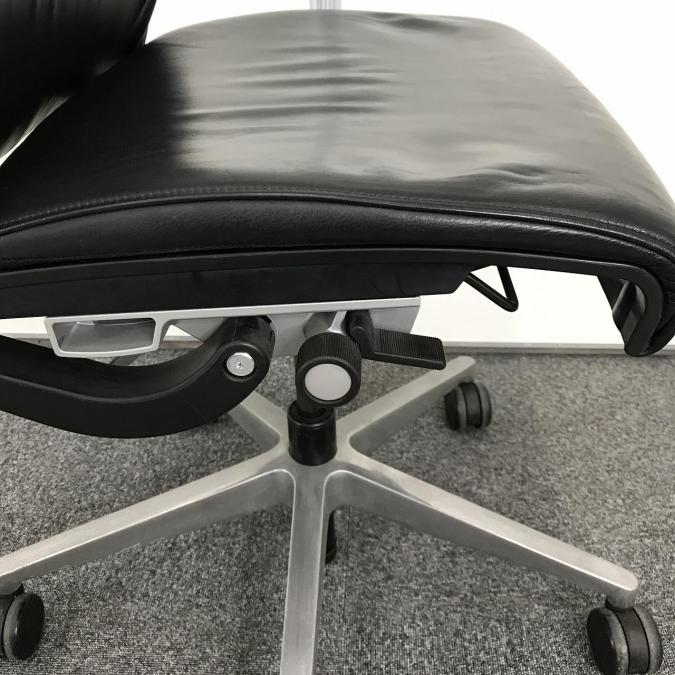 快適な座り心地に不可欠な調節機能である、上下昇降、座面の奥行き調整、リクライニングなどを備えており、操作もわかりやすく好評です。 特に、座面の奥行きは、座面下の左右に通った細いバーで調整でき、座ったままで軽やかに滑るように調整が可能です。 価格面では、新品では高めですが、中古は流通も多く、定価の3割前後の価格で高級チェアの座り心地を手に入れることができます!