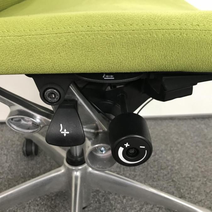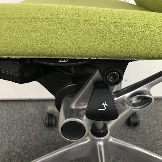 両手えお自然に下した位置にあるレバーで、座面の奥行きを前後に50mm調節出来ます。