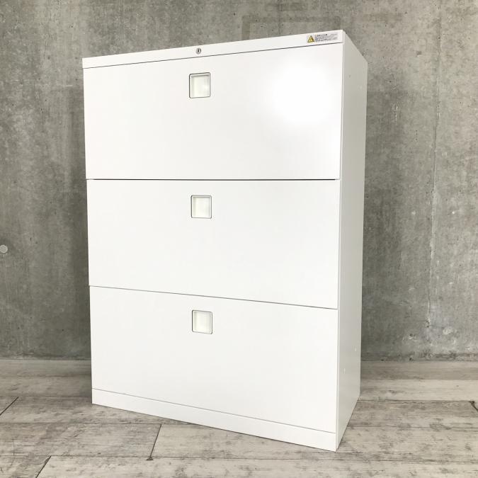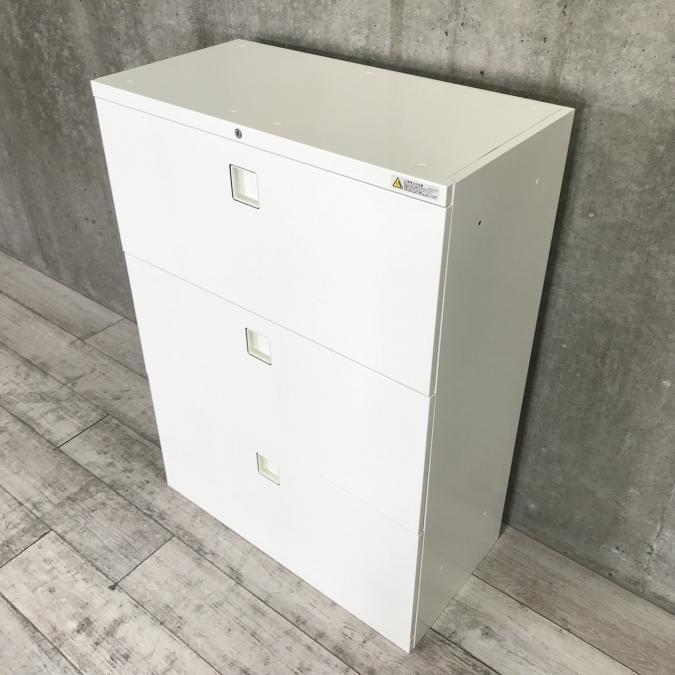 オカムラ レクトライン 3段ラテラル書庫 ホワイト天板 シリンダー錠 鍵付き ※取っ手部分に若干日焼けあり