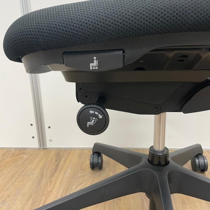 - 座面の左にあるレバー操作により、座面の奥行き調整が可能です。(ストローク:50mm)