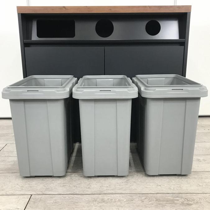 一般ゴミ用の角形、ペットボトル用、缶ビン用の丸形と直感的に分かりやすいデザインになっています。