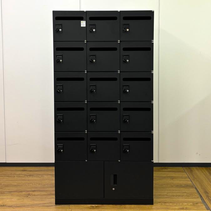 【省スペースで15人分収納できます!ブラックのかっこいいロッカー】【両開き書庫を連結仕様】 ■イトーキ製 15人用ロッカー 3列×5段 ■メール投函口付 ブラック ■シリンダー錠【なんば店撮影】- なんば日本橋店