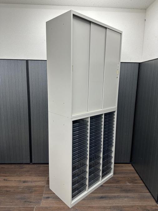 オカムラ製レクトラインシリーズ ㊤3枚引戸㊦クリスタルトレイ書庫※トレイが一つございません- 岐阜店