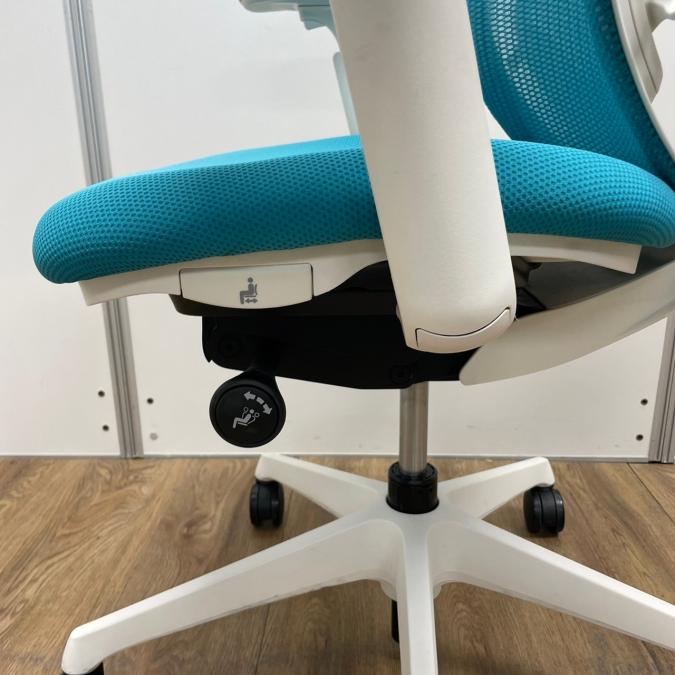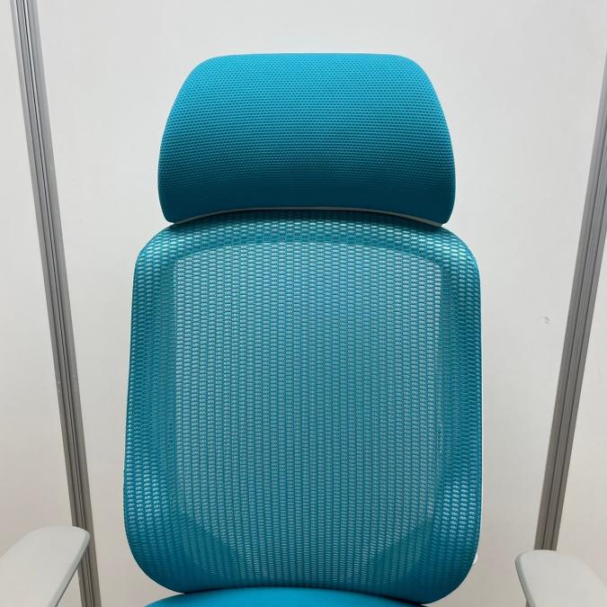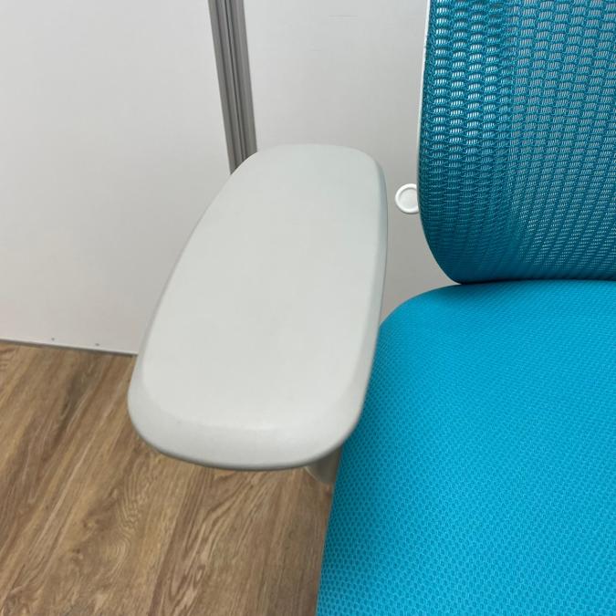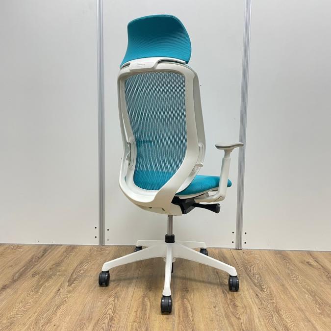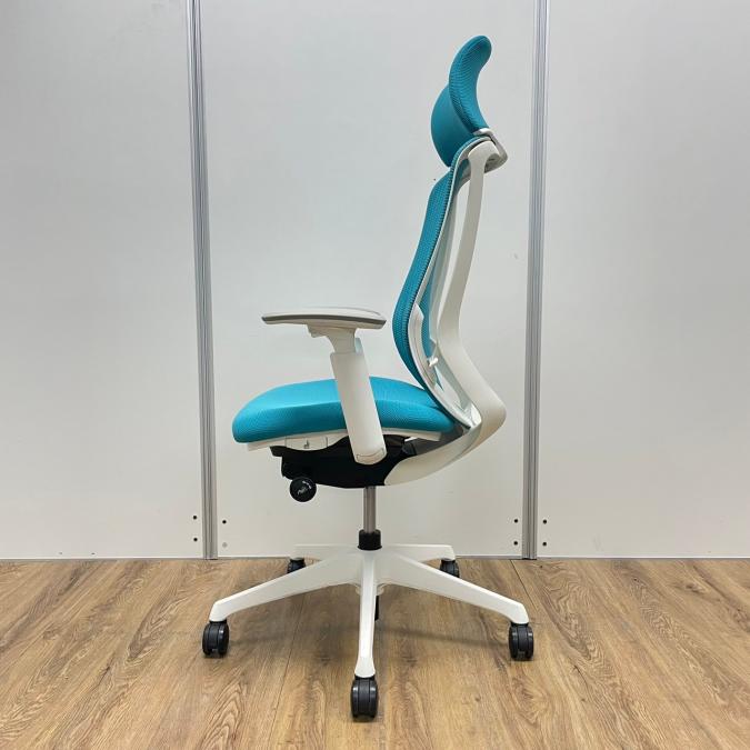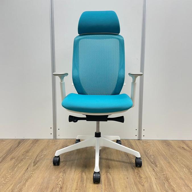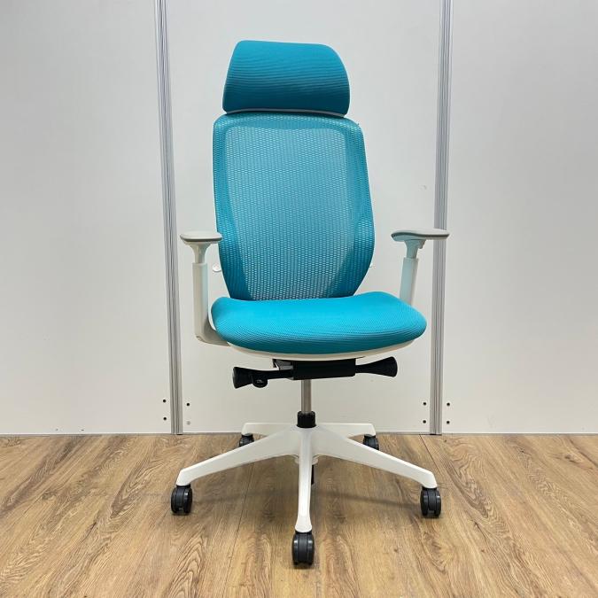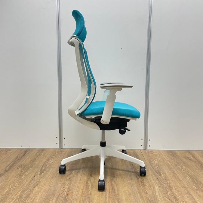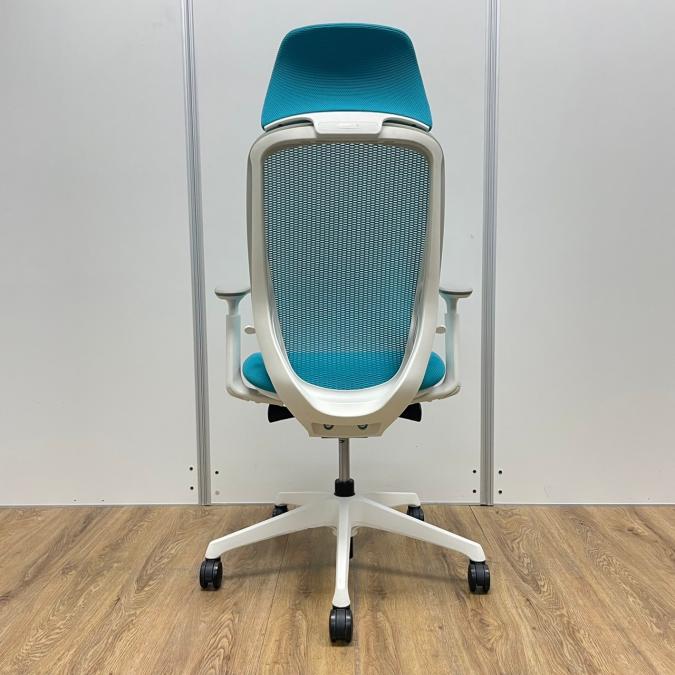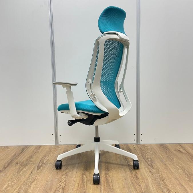 【レア:ヘッドレスト付き】オカムラ製 シルフィーシリーズ ブルーグリーン 樹脂脚 ホワイトフレーム アジャストアーム※可動肘 肘付ハイバックチェア!!- 京都東寺店