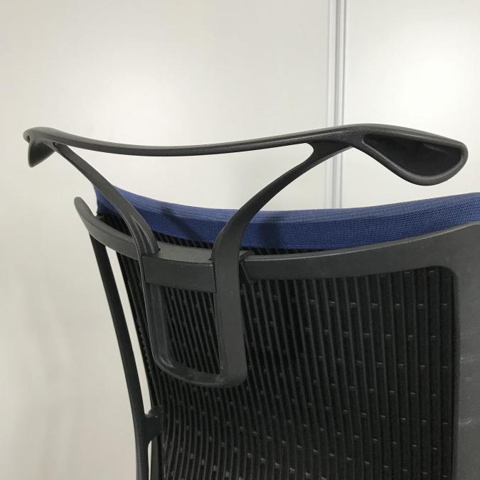 【人間工学に基づいた快適な座り心地!背によりかかるとバックシェルのグリッドが変形し、やさしくワーカーの身体を支えます!】■オカムラ(okamura)製 ヴィスコンテチェア (Visconte) 肘付きローバック ■固定肘 ■ミディアムブルー×ブラックシェル