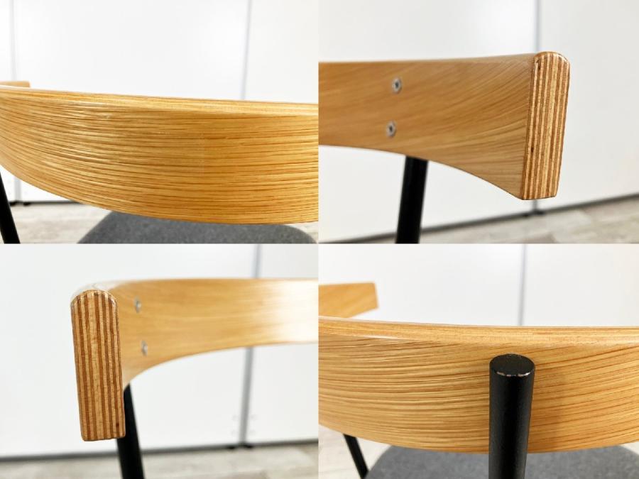 左右に回り込んだ成型合板の丸くて細い背は、ほどよく体を支え、かつちょっとしたアームとして肘をかけることもできます