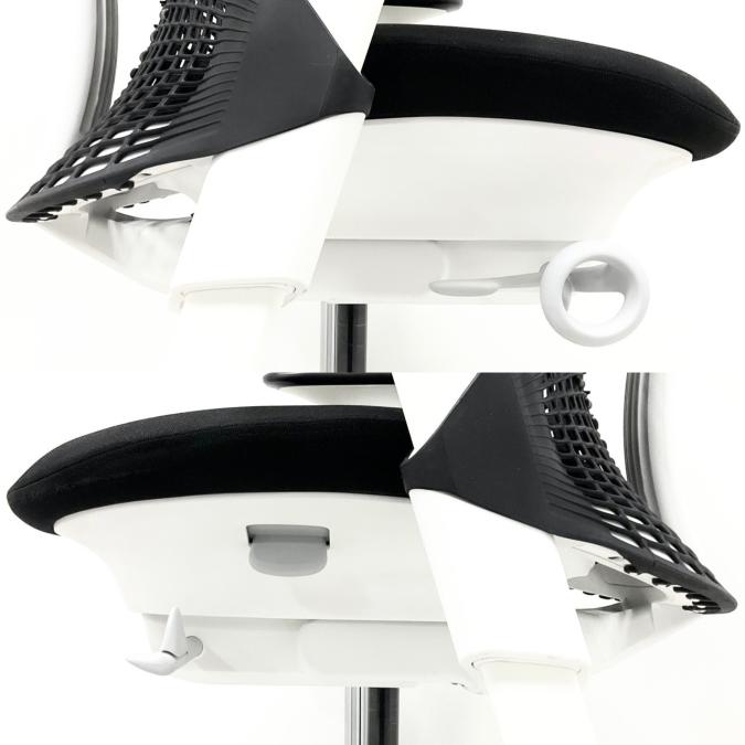 - 座ったまま、レバー操作一つで、簡単に座面を前傾できます。前傾姿勢を取ることが多いデスクワーカーに最適です。