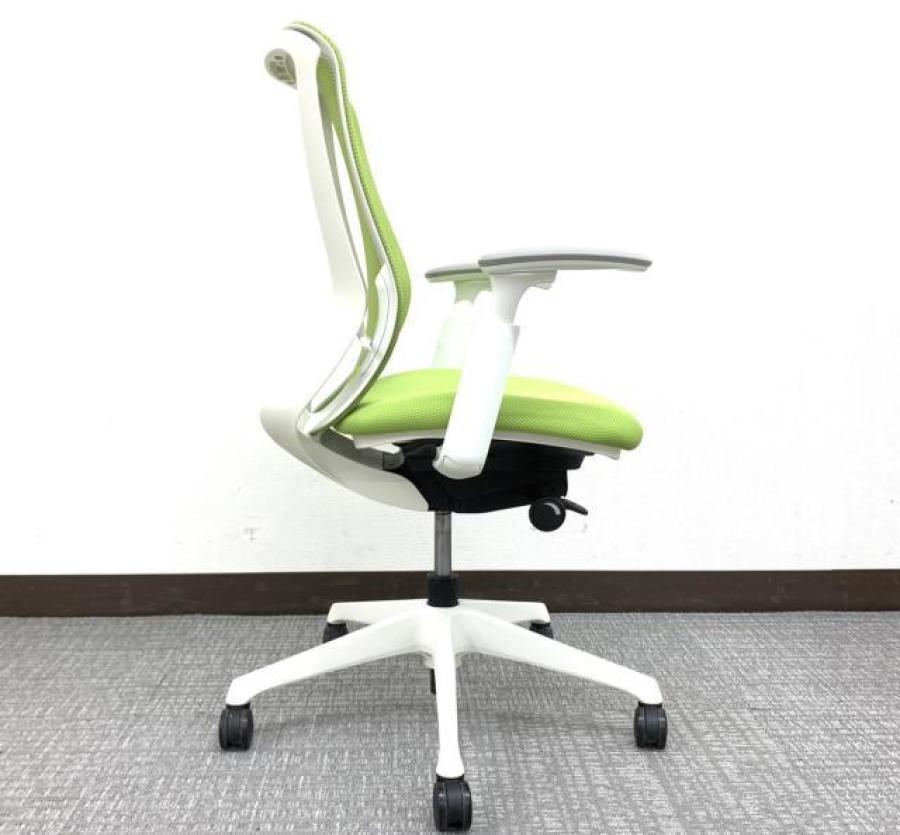 【いま人気のワーキングチェア!新感覚のオフィスシーティング!】■オカムラ シルフィーチェア 可動肘付 ライムグリーン ハンガー付 ※肘に擦れがあるためお安く!【前傾チルト機能付】【A01040979】