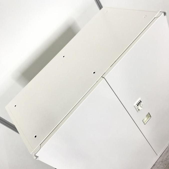【オフィスの書類をスッキリ整理!取っ手がどの方向からでも開くマルチハンドル!】■オカムラ(okamura)製 レクトラインシリーズ 両開き書庫 ローキャビネット ■本体色:ホワイト ■シリンダー錠 ■ナチュラル天板付き
