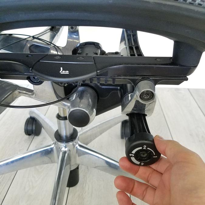 - ロッキングの強弱を調整するダイヤルがございます。体型に合わせてリクライニングの固さを座ったままで調整できます。