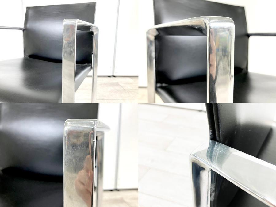 軽快でミニマルなデザインのチェア。ソリッドな印象のアルミはオフィスや公共の場所で理想の空間を演出。フレームを封筒に収めたように覆う革は、継ぎ目が外から見えない形状(インビジブルステッチ)の仕上げとなっています。美しさとともに機能面にもすぐれ、曲線を描くウレタンのシート部分は最高のすわり心地を与えてくれます。