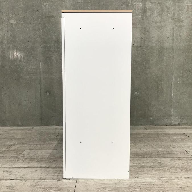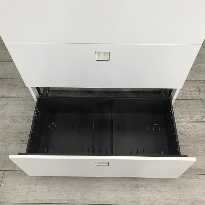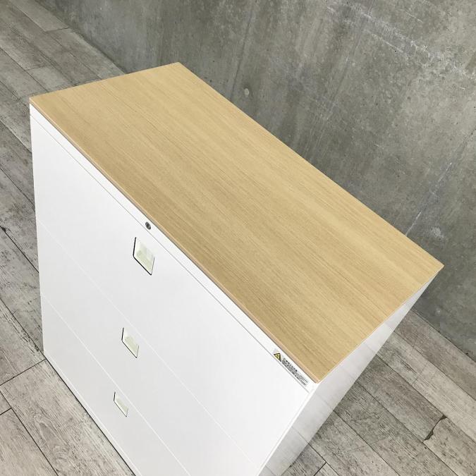【オフィスの書類をスッキリ整理!取っ手がどの方向からでも開くマルチハンドル!】■オカムラ(okamura)製 レクトライン 3段ラテラル ローキャビネット(W900×D450×H1115) ■ホワイト ■シリンダー錠 ■ナチュラル天板付- 品川・三田店