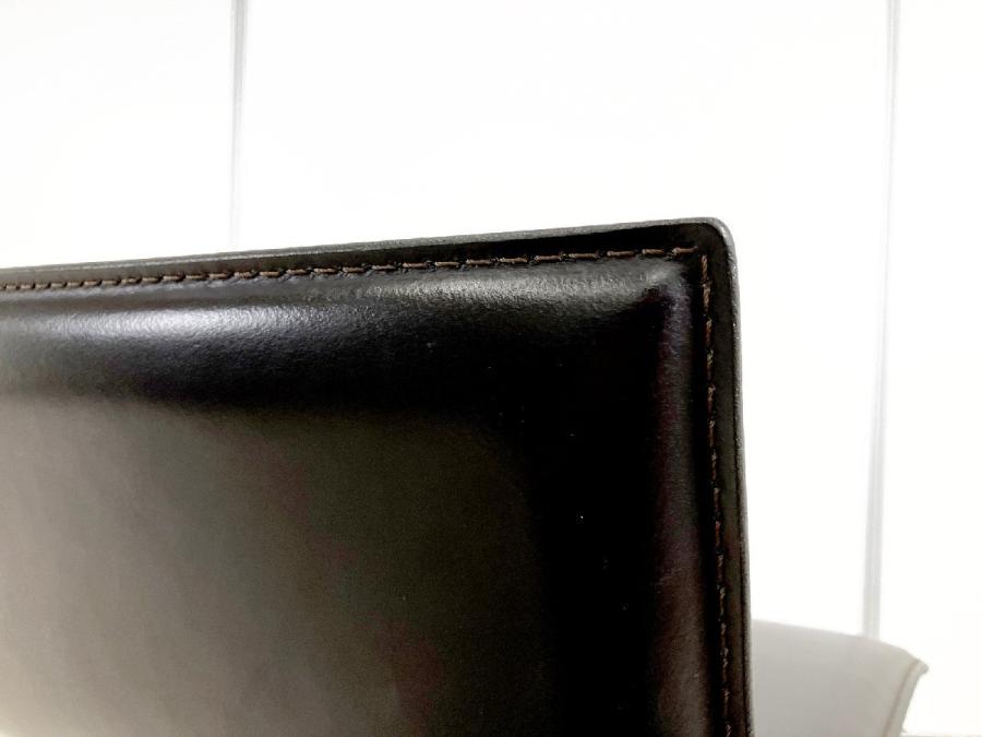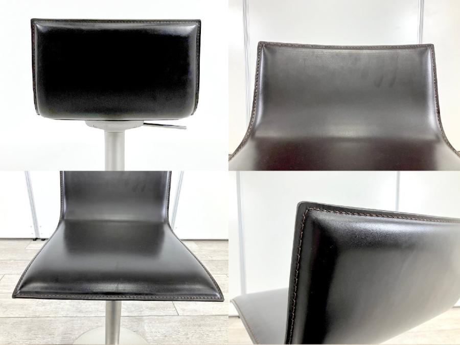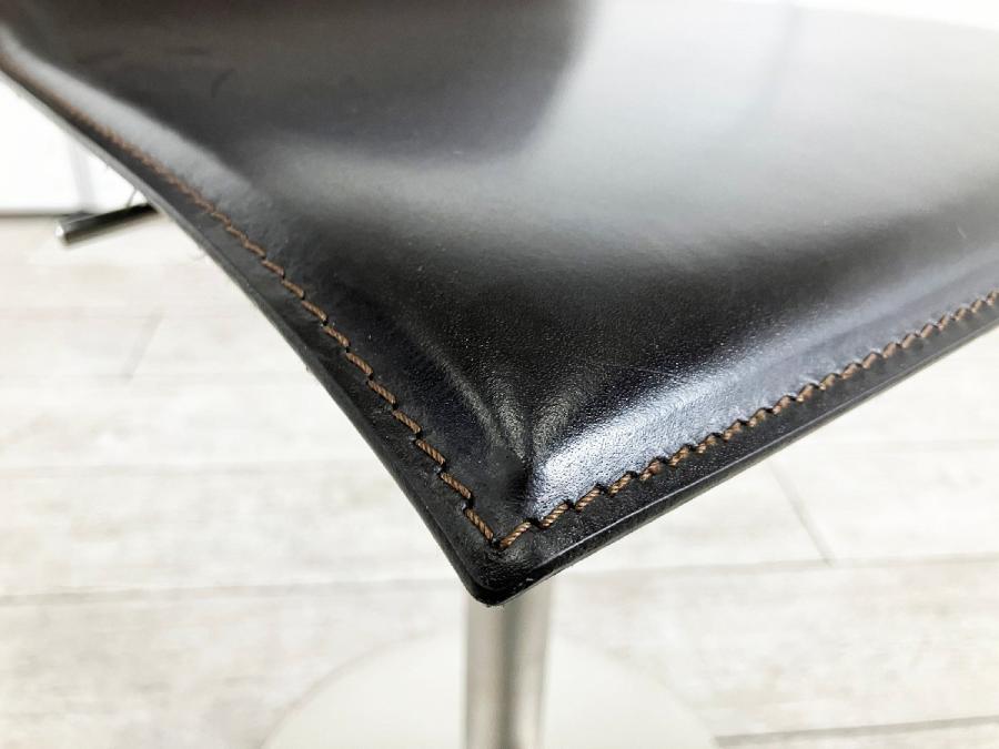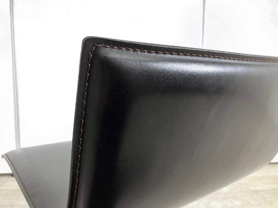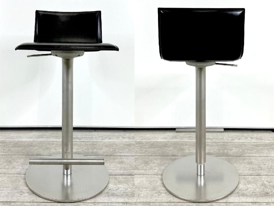 シートの薄さと洗練されたラインが特徴。本革の張り地で、上質な触り心地を演出し、ミニマルな造形に説得力を与えています。回転式で立ち座りがしやすく、ガススプリングにより、540mmから790mmまでの可動域で高さ調節も自在。フットレストも座面と一体で動くので腰と脚の位置関係は変わらず、快適な掛け心地を維持します。