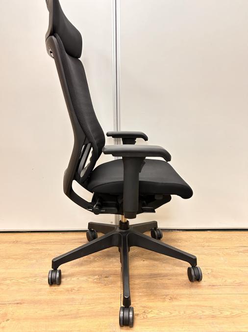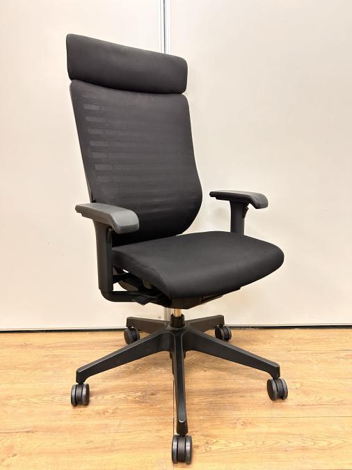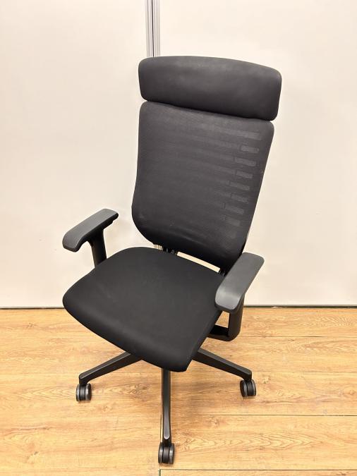【ヘッドレスト付き!】【1脚限定の為、クレジット決済優先】【姿勢の変化をサポート!操作レスで体格にマッチする定番チェア】■イトーキ(ITOKI)製 エピオスチェア(epios) 肘付き エクストラハイバック 背面メッシュ ■固定肘・ヘッドレスト付 ■ブラック