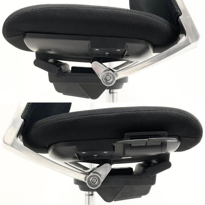 - 座る人の体格に合わせて、シート奥行きは前後54mm、高さ100mmの調整が可能です。また、調整レバーを座面シートの側面に設けることで、座ったままの姿勢で操作することができます。
