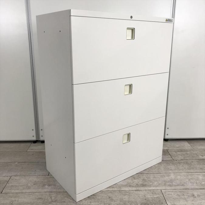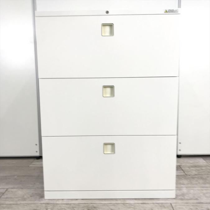 オカムラ レクトライン 3段ラテラル書庫 ホワイト天板 シリンダー錠 鍵付き ※取っ手部分に若干日焼けあり