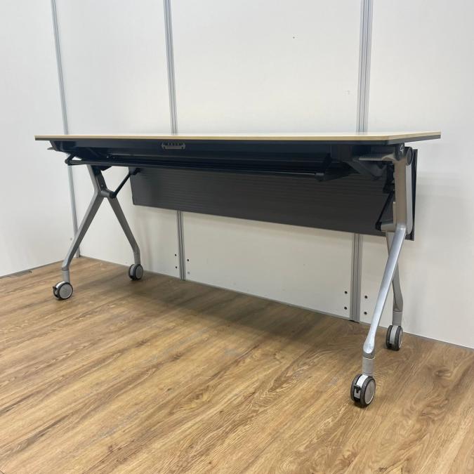オカムラ製 インターアクトシリーズ ナチュラル木目柄 W1500/D450 スタイリッシュなデザインで高品質!使い勝手のよい天板跳ね上げ式のフラップテーブル サイドスタックテーブル!!- 京都東寺店