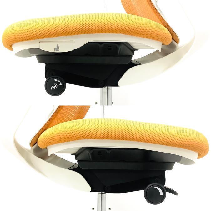 - 座面右下のダイヤル操作で、リクライニングの強弱調整が行えます。これまでのダイヤル式よりも、少ない回転数で、最弱?最強の調整が可能です。