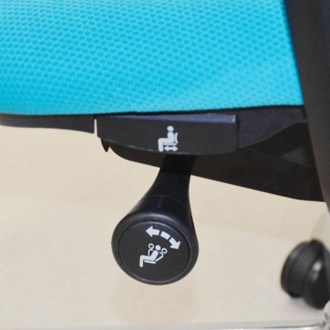 - 座面の左にあるレバー操作により、座面の奥行き調整が可能です。(ストローク:50mm)