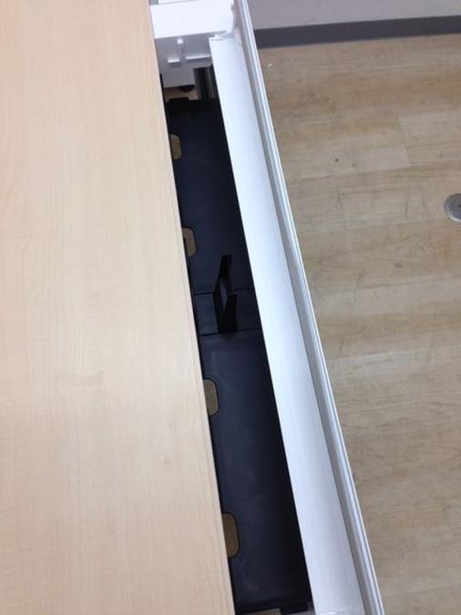 - 地震時、センター引出しが飛び出さないよう、ラッチ機構を装備。脚はデスクの横ズレを軽減させる設計になっています。