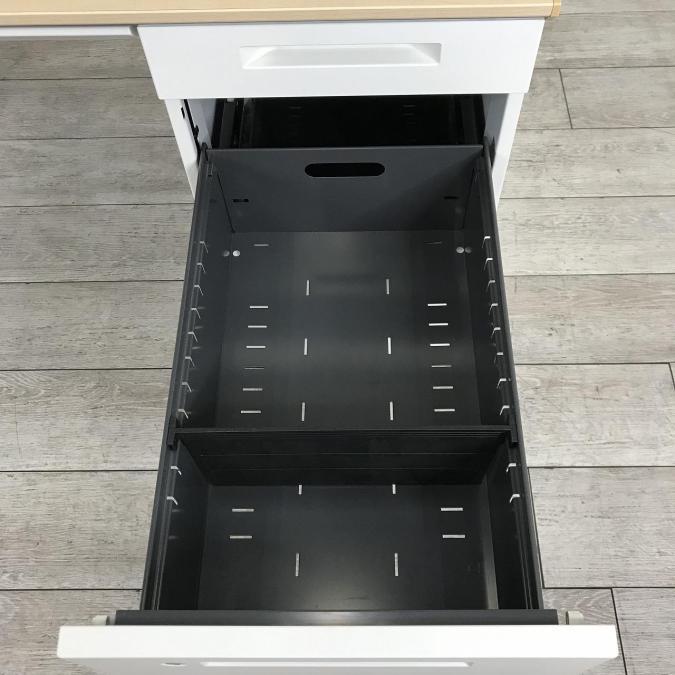 - 地震時、センター引出しが飛び出さないよう、ラッチ機構を装備。脚はデスクの横ズレを軽減させる設計になっています。