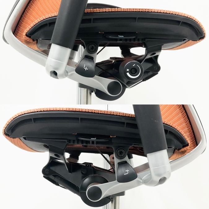 座面の前後スライド調整(前後50mm)は、両手を自然に下ろした位置にあるレバーで簡単に操作できます。