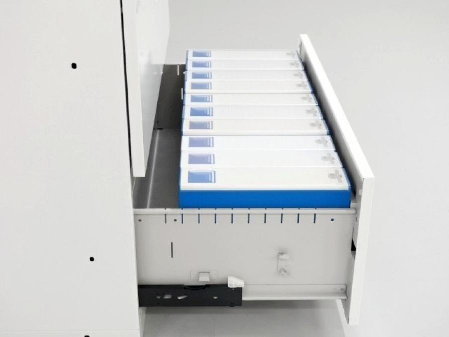 A4縦型ファイル(厚さ75mm)を1段に10個収納できます。
