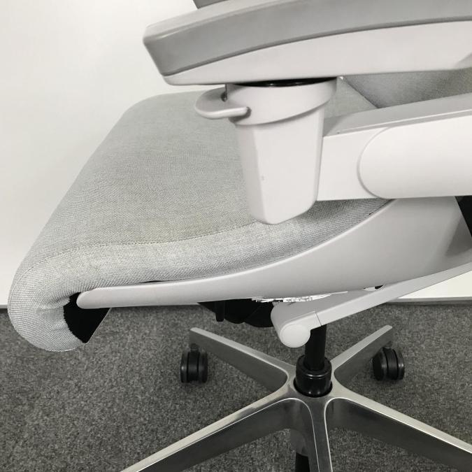 →座面下のレバー操作により、体格に合わせたポジショニング設定が座った状態でできます。座の前縁部が折れ曲がる方式の採用で、ベンディングシートの相性もさらによくなりました。