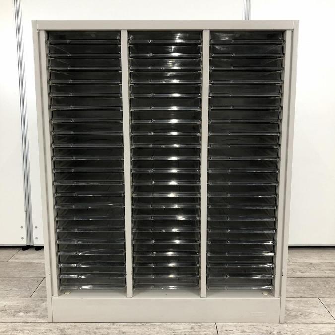 A4サイズのトレー3列タイプで、書類や文房具など、オフィスの小物類を細かく仕分けて収納するのに便利です。