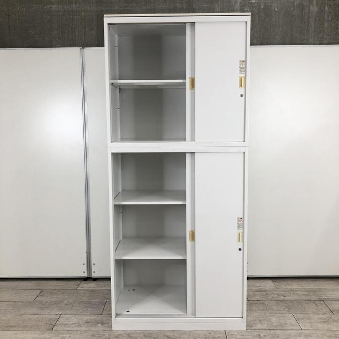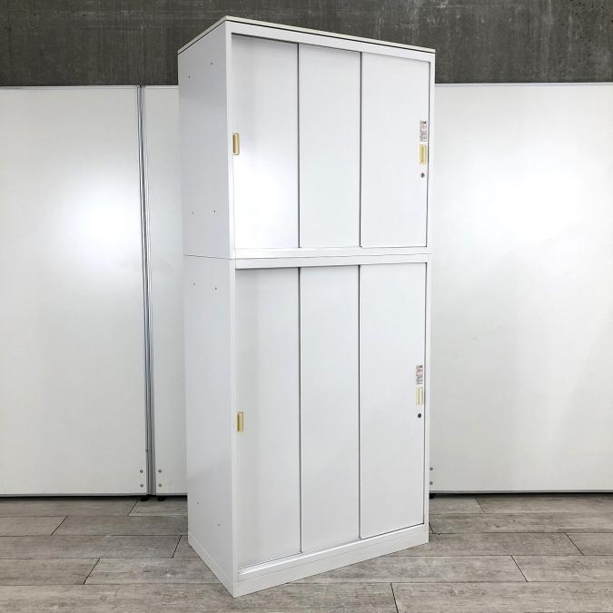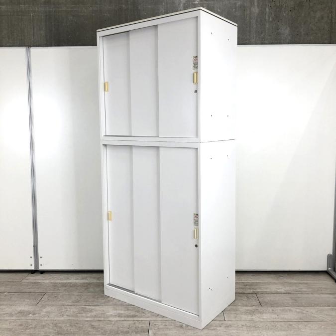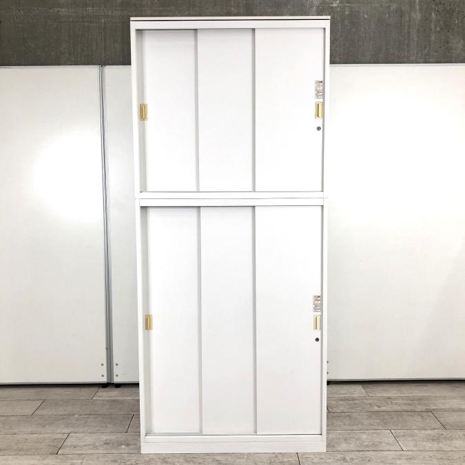 オカムラ製 レクトラインシリーズ ホワイト シリンダー W800xD450xH2150サイズ W800サイズ スリムサイズ 3枚戸タイプ ハイキャビネット スライド引き戸だから開閉スペースに困らない! 上下書庫セット 3枚引き違い書庫セット!!