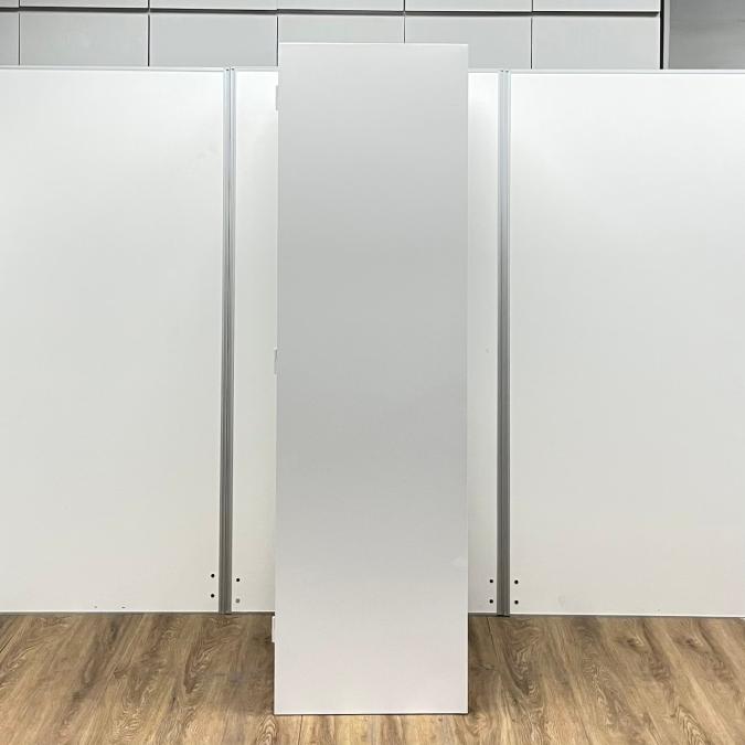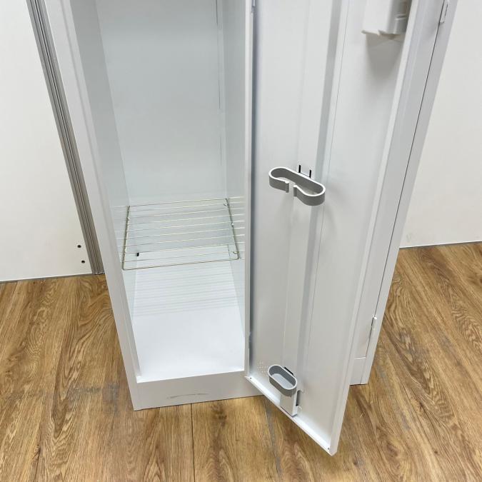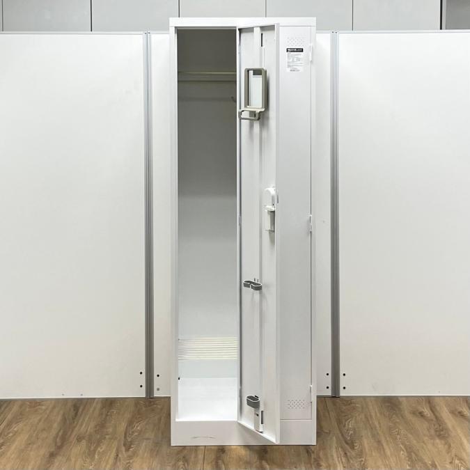 汚れの目立たない明るいグレー色のスリムなロッカーです。