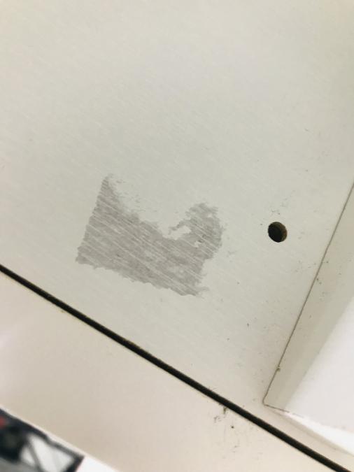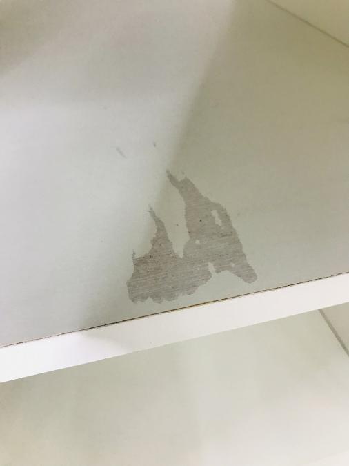 - あり黄ばみ・変色が広い範囲にうっすらある、または濃い黄ばみ・変色が一部ある。(例、天板、幕板、棚板、サイド部分、脚部等にある。)