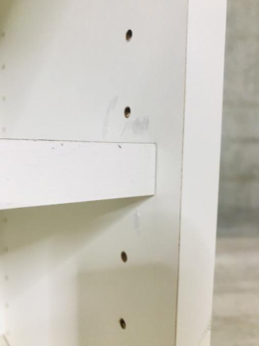 - かなり強い濃い黄ばみ・変色が商品全体にある。(例、天板、幕板、棚板、サイド部分、脚部等にある。)
