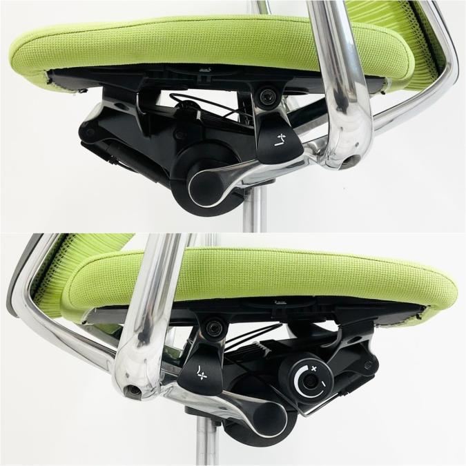 両手を自然に下ろした位置にあるレバーにて、座面の前後スライド調整(前後50mm)が可能です。