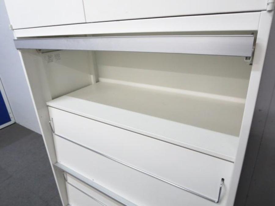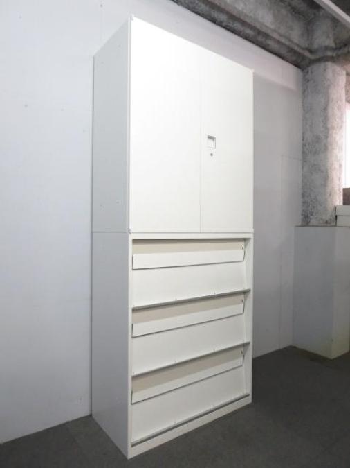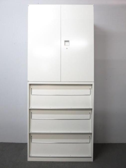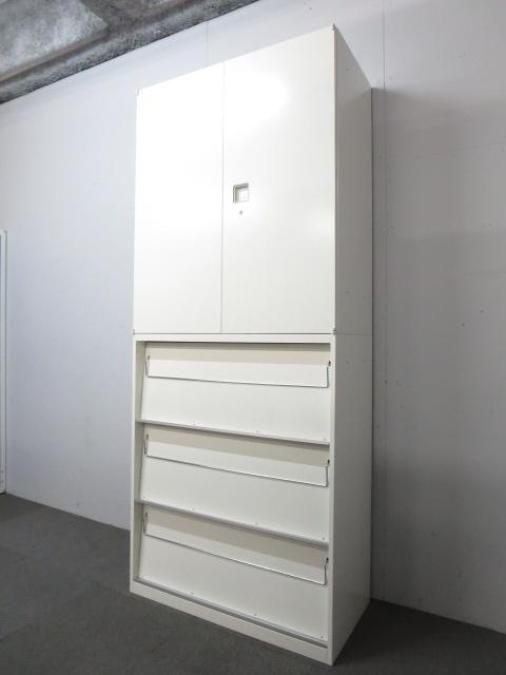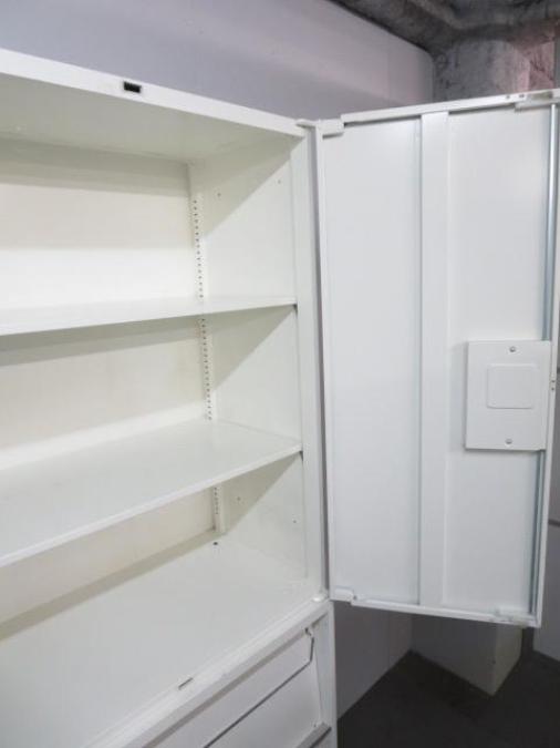 スライド式の扉+引き出しタイプの便利な書庫セットが入荷!使い勝手抜群のハイキャビネットが入荷! ■オカムラ/レクトライン/ホワイト 2枚引き戸+3段ラテラルキャビネット