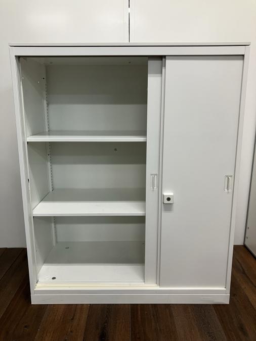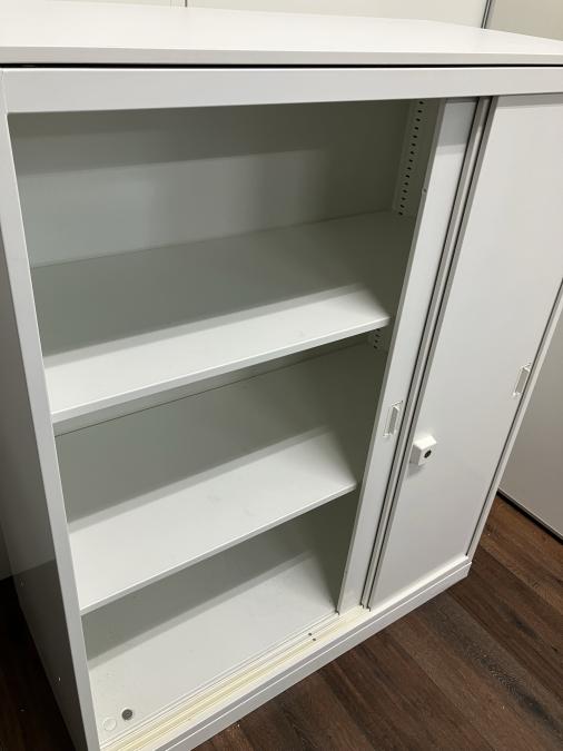 スライド式の扉のため導線を邪魔しません!使い勝手抜群の2枚引き違い書庫が入荷! ■オカムラ/レクトライン/ホワイト 2枚引き戸