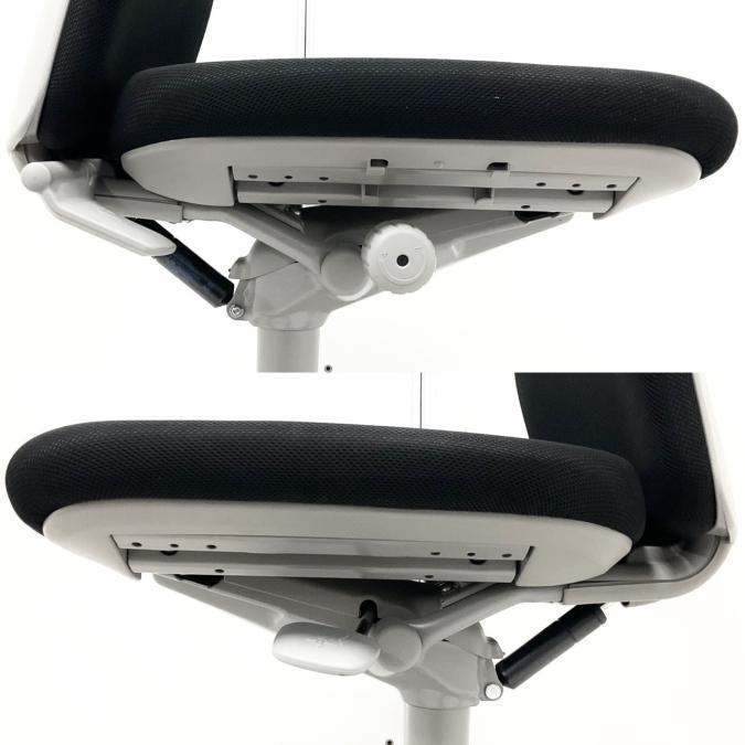 もう一つは、オカムラ社独自の""異硬度クッション""が座面に採用されていることです。これは座面が位置により異なる硬さのウレタンでできており、前方は腿裏を圧迫しないようソフトに、後方はしっかりと体重を支えるために少し硬めに作られています。クッション性とホールド感の両立により、長時間の作業での疲れを軽減してくれます。"