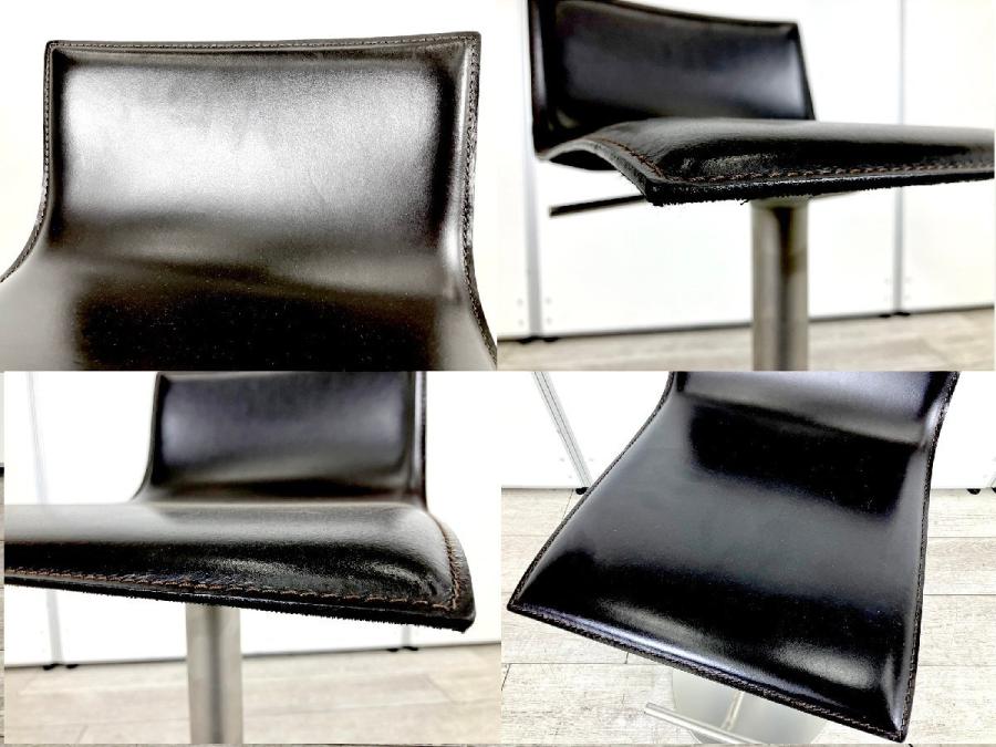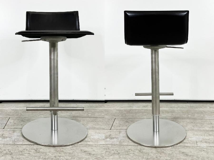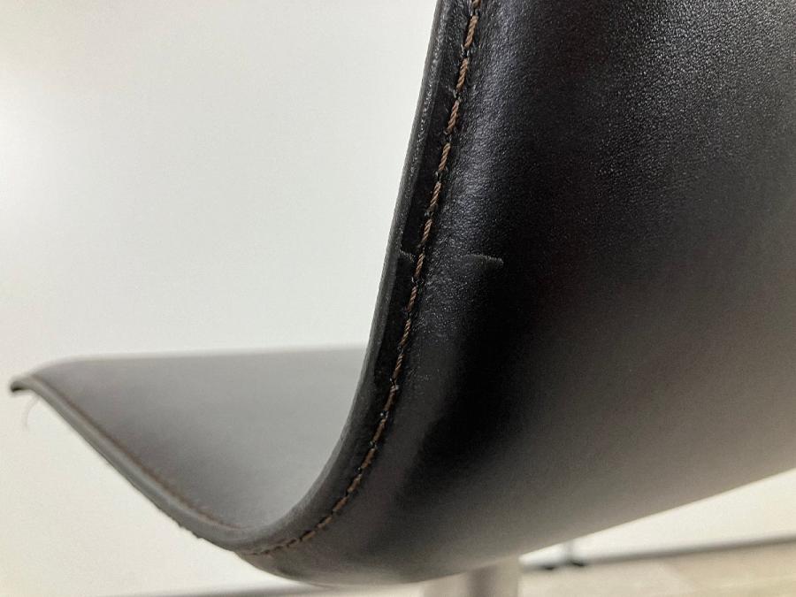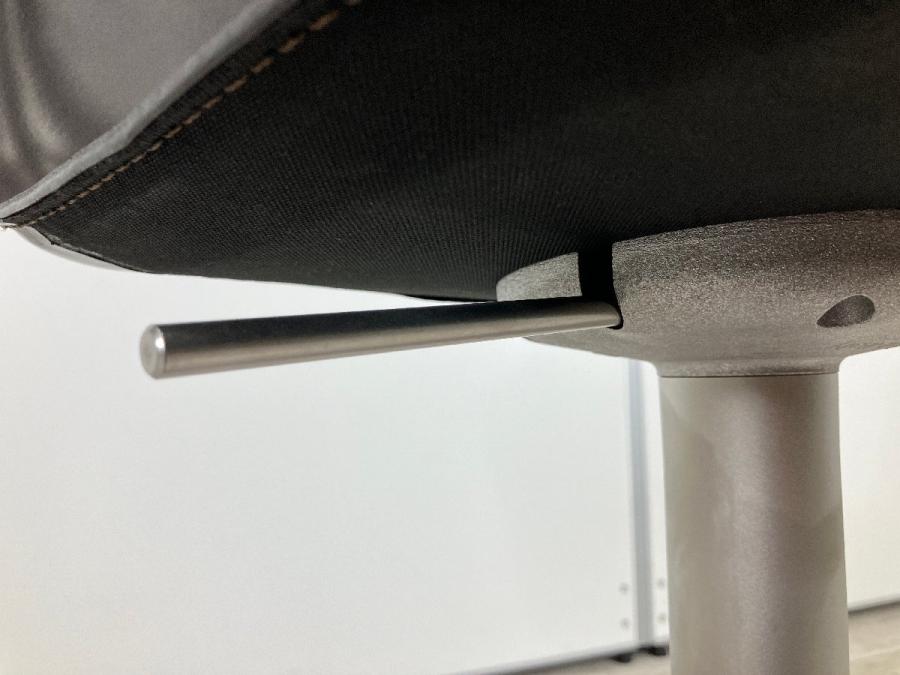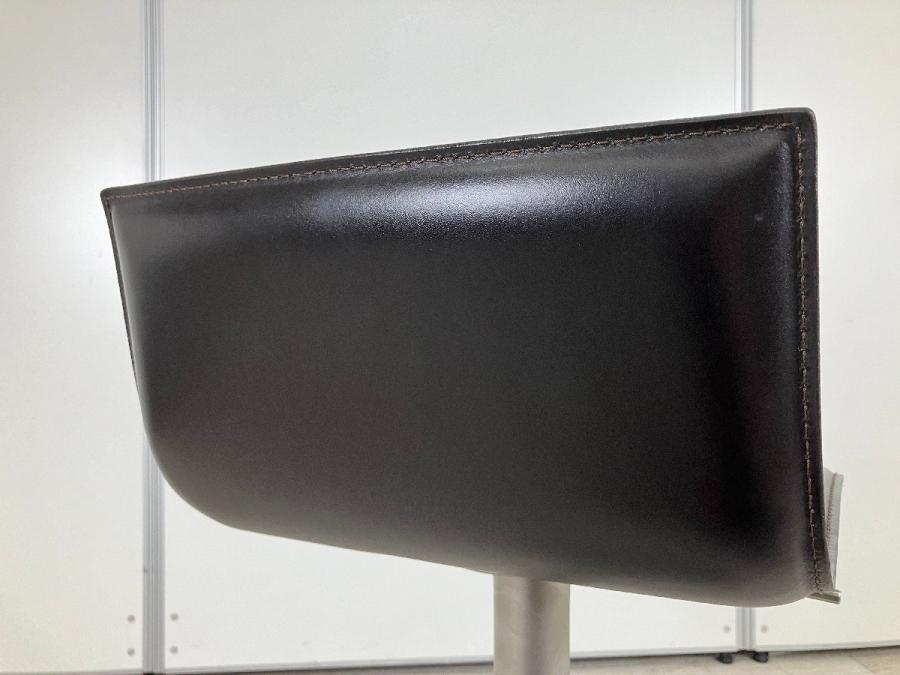 シートの薄さと洗練されたラインが特徴。本革の張り地で、上質な触り心地を演出し、ミニマルな造形に説得力を与えています。回転式で立ち座りがしやすく、ガススプリングにより、540mmから790mmまでの可動域で高さ調節も自在。フットレストも座面と一体で動くので腰と脚の位置関係は変わらず、快適な掛け心地を維持します。