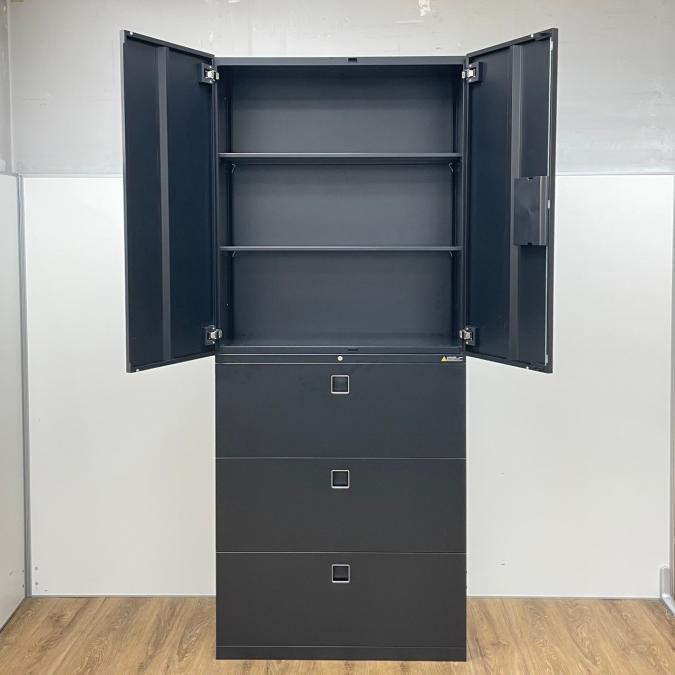 【在庫入替セール】【1セットのみ】オカムラ製 大人気のレクトラインシリーズ ブラックカラー 両開き+3段ラテラル 上下書庫セット!!- 神戸・三宮店