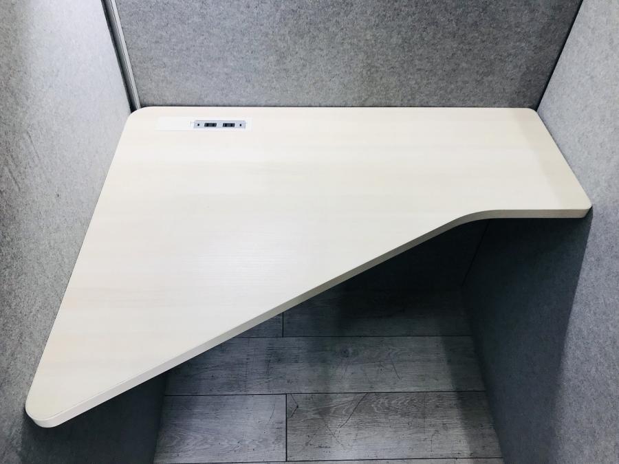 視線がブースの角に向かい、周囲の人の動きが視界に入りにくくなるようにデザインされたワーク天板。