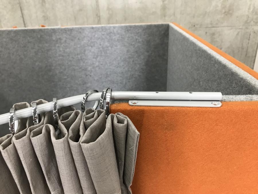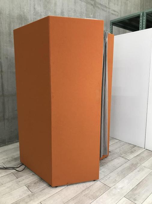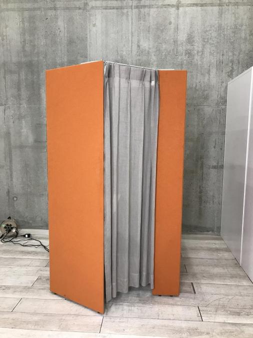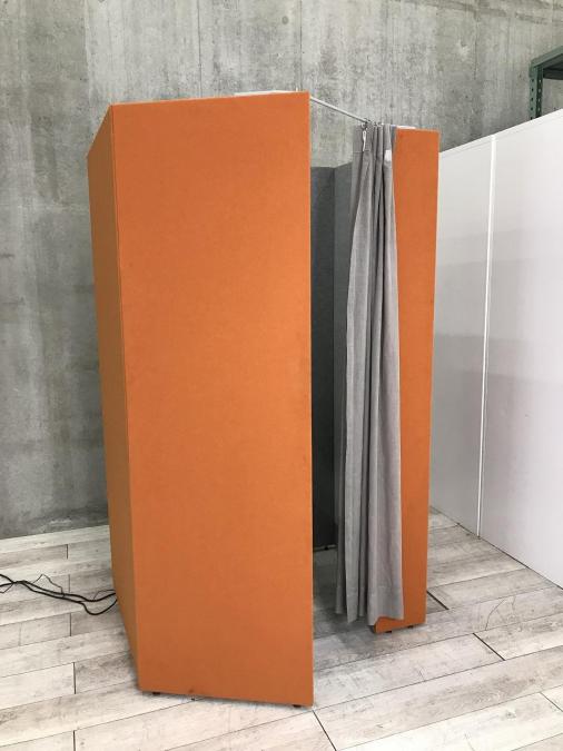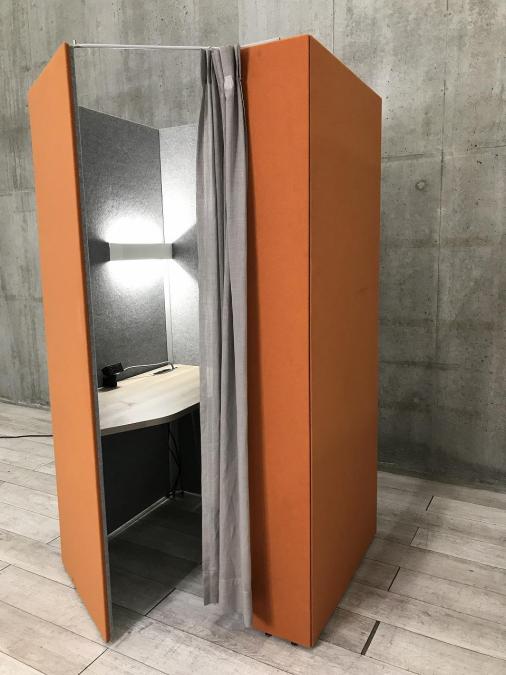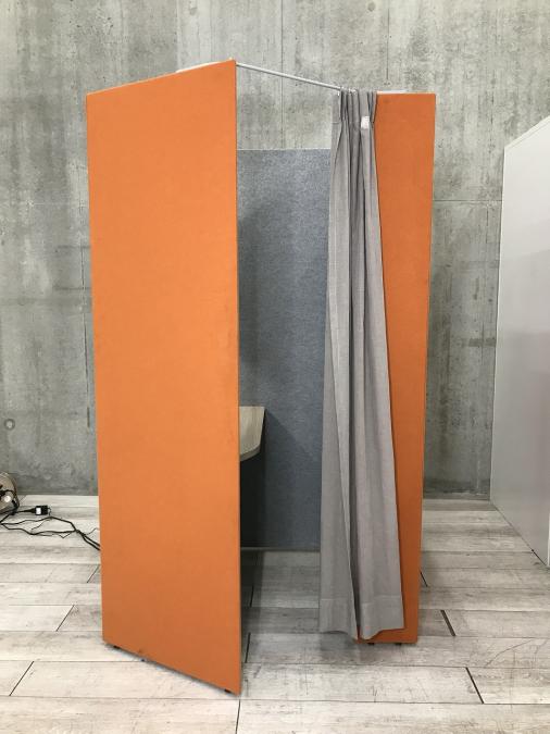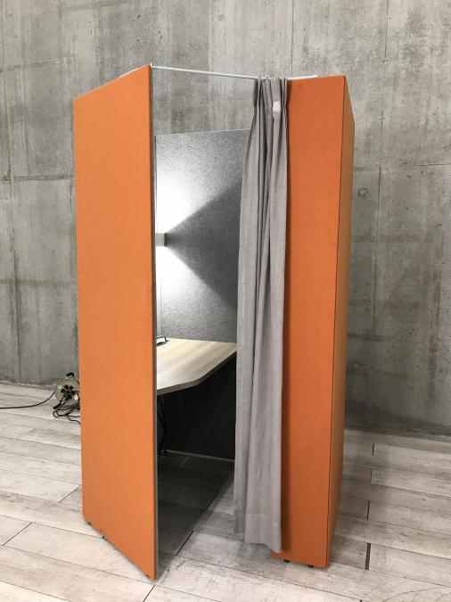 【1人用ワークブース!】【カーテン付の商品です!高めのパネルでやさしく囲い込み、リラックス感を醸し出してくれます!配線ユニットとライト付き!】■オカムラ(okamura)製 ドレープ 集中ワークブース (W1160/D1100/H1920) ■パネル:オレンジ/ライトグレー×天板:ナチュラル ■コンセント2口付【ABW商材】【関東倉庫在庫品】【弊社使用欄:A00950997】- 全店共通商品