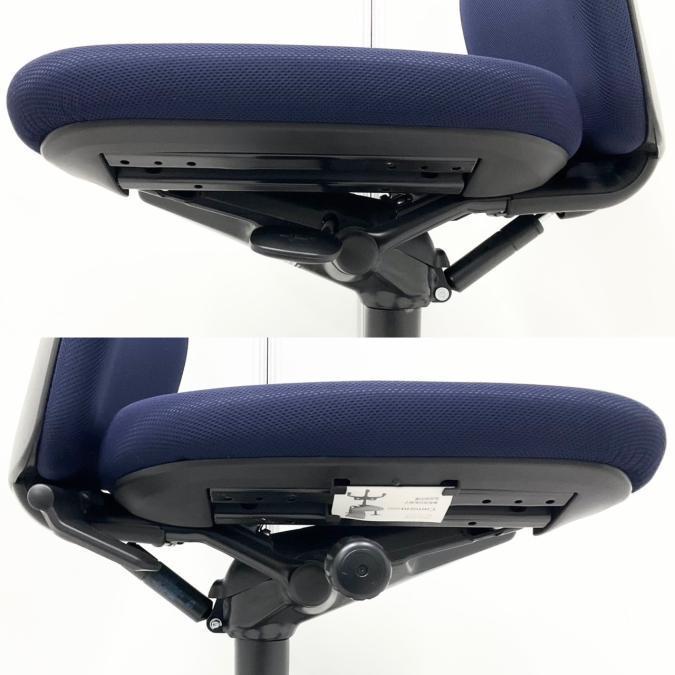 もう一つは、オカムラ社独自の""異硬度クッション""が座面に採用されていることです。これは座面が位置により異なる硬さのウレタンでできており、前方は腿裏を圧迫しないようソフトに、後方はしっかりと体重を支えるために少し硬めに作られています。クッション性とホールド感の両立により、長時間の作業での疲れを軽減してくれます。"
