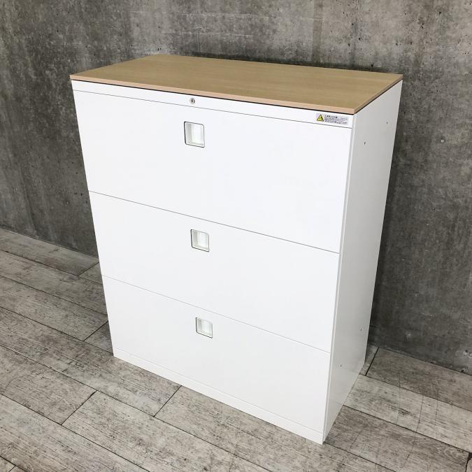 オカムラ レクトライン 3段ラテラル書庫 ホワイト天板 シリンダー錠 鍵付き ※取っ手部分に若干日焼けあり