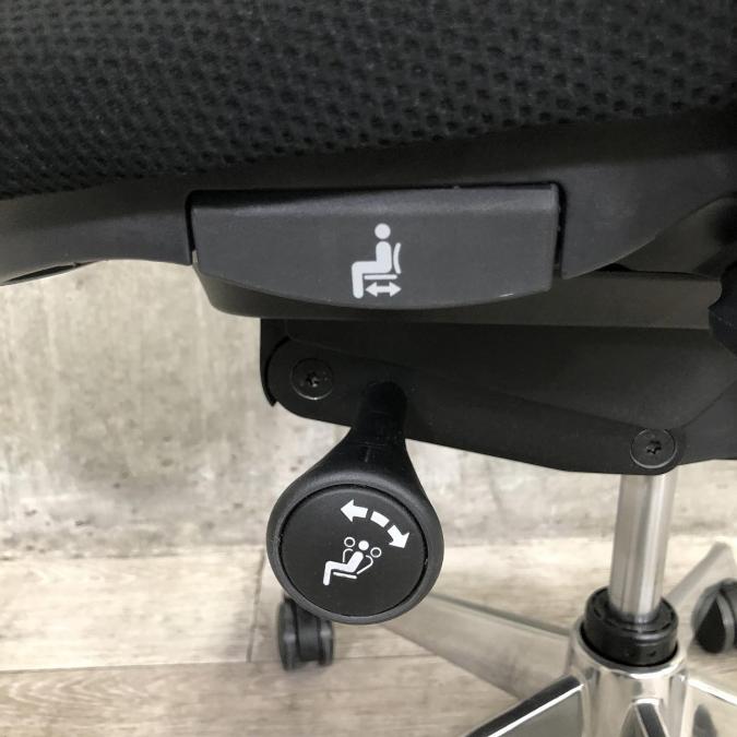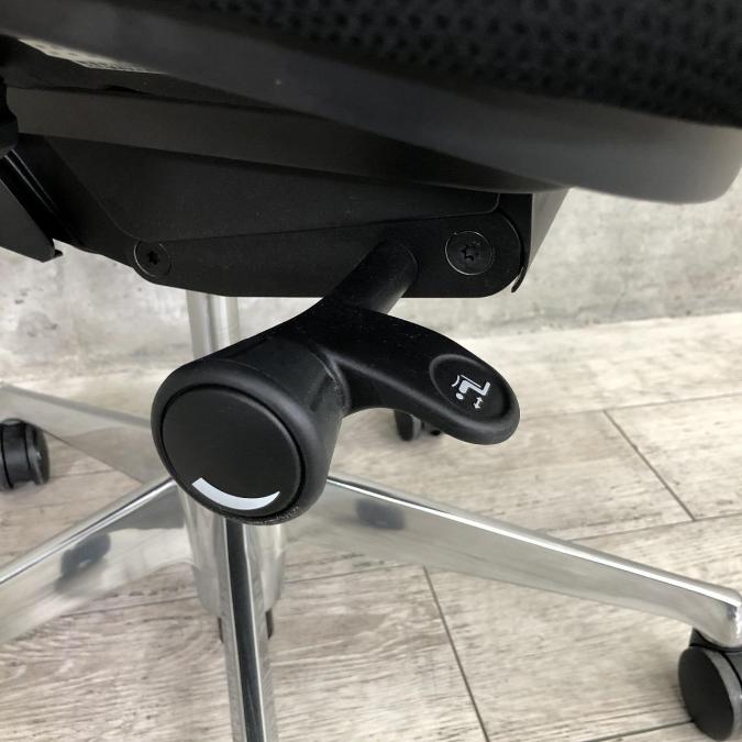 - 座面右下のダイヤル操作で、リクライニングの強弱調整が行えます。これまでのダイヤル式よりも、少ない回転数で、最弱?最強の調整が可能です。