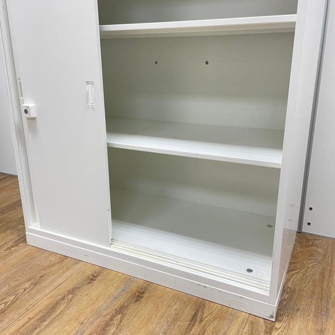スライド式の扉+引き出しタイプの便利な書庫セットが入荷!使い勝手抜群のハイキャビネットが入荷! ■オカムラ/レクトライン/ホワイト 2枚引き戸+3段ラテラルキャビネット