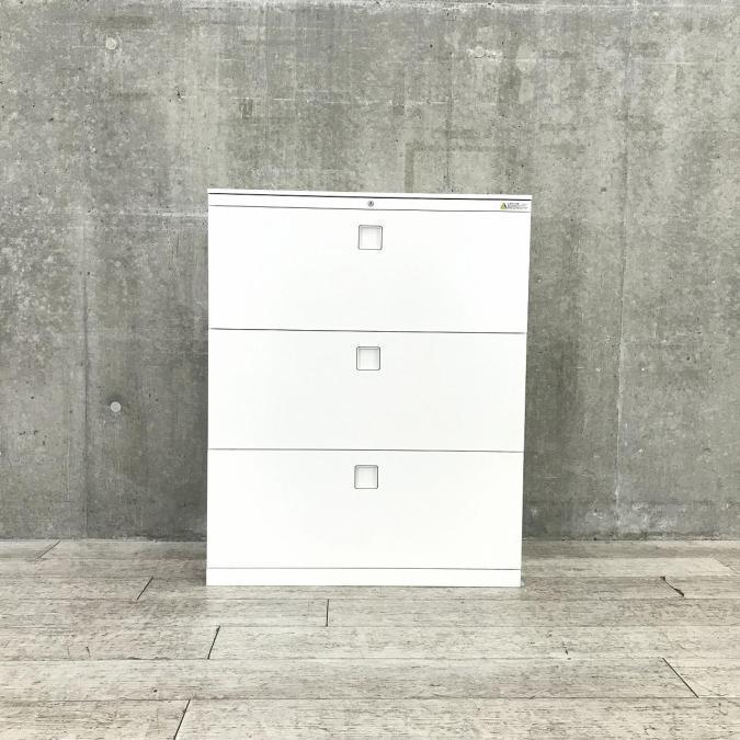 オカムラ レクトライン 3段ラテラル書庫 ホワイト天板 シリンダー錠 鍵付き ※取っ手部分に若干日焼けあり